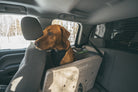 Rubicon Dog is an Open Top Crate and the latest innovation in pet travel. This patent pending rigid structure is the first of its kind, combining the benefits of a dog crate with the safety benefits of a dog car harness. Rubicon Dog is a parallelogram-shaped forward-facing platform with side entries, which is sandwiched between the vehicle’s front and back seat, only using one of the back seats in most 4-door cars, trucks and SUVs. It does not fit in most 2-door coupes, jeeps, or small pickups. Please use the dimensions provided below to determine fitment in your vehicle.